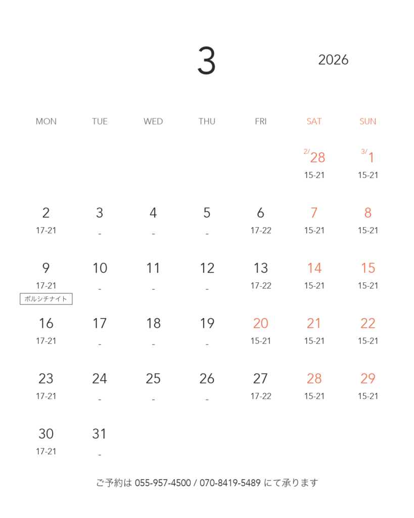 〈ご予約はお電話で〉 055-957-4500 / 070-8419-5489